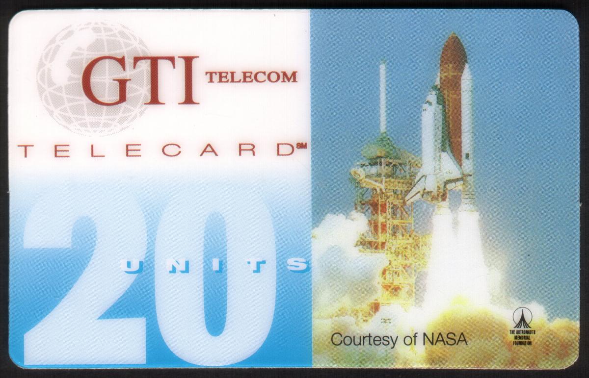 Text on the card identifies NASA and the Kennedy Space Center, reinforcing its connection to landmark space programs and Florida attractions. The card is branded with the note "Courtesy of NASA," indicating official NASA imagery used to celebrate space exploration milestones. Additionally, it bears the logos of Portuguese company GTI Telecom, Inc., pointing to its production origin or distribution. This phone card is a collectible item that appeals to enthusiasts of space, travel, and Americana.
