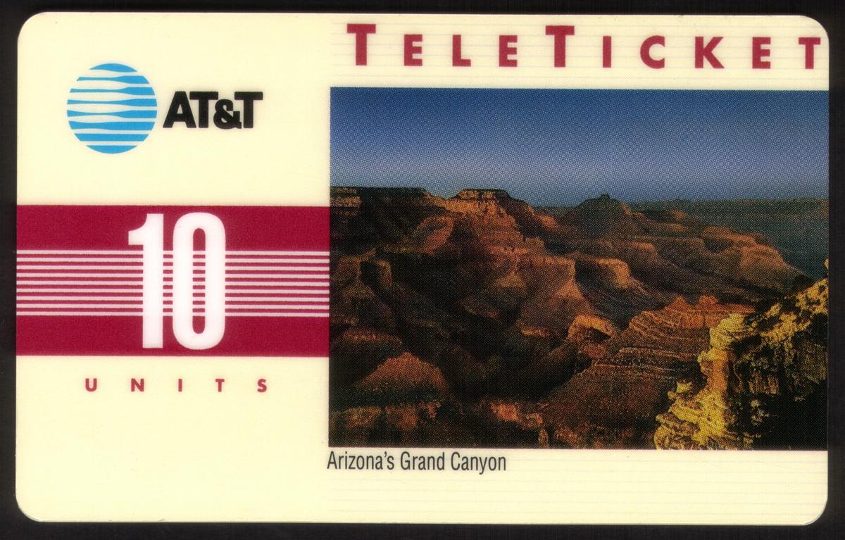 This collectible AT&T Teleticket phone card features a vibrant photographic image of Arizona's Grand Canyon. The scenic view showcases the vast, rugged terrain of the Grand Canyon under a clear sky, highlighting the layers of orange and brown rock formations typical of this iconic natural landmark. The photograph captures the natural geology and expansive landscape that epitomize this famous tourist attraction and National Park.