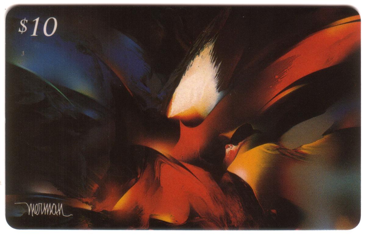 The card includes textual elements identifying the artist’s name, Leonardo Nierman, and the title of the artwork, "Magic Fire." It also displays the denomination of $10, indicating the card’s value. Additionally, the name “Teleworld Internat’l” is printed on the card, signifying the issuing entity. The layout is clean, with the artwork prominently centered and the text placed clearly without interfering with the visual impact of the painting.