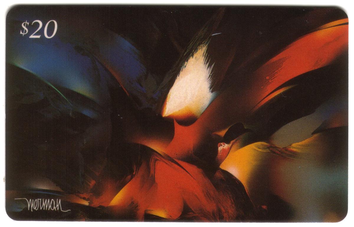 "Magic Fire" is prominently credited to Leonardo Nierman on the card, along with the denomination of $20. The card is issued by Teleworld Internat'l, indicating its origin and distribution. The composition embraces abstract art elements, combining both sharp and smooth lines that create an engaging visual rhythm.