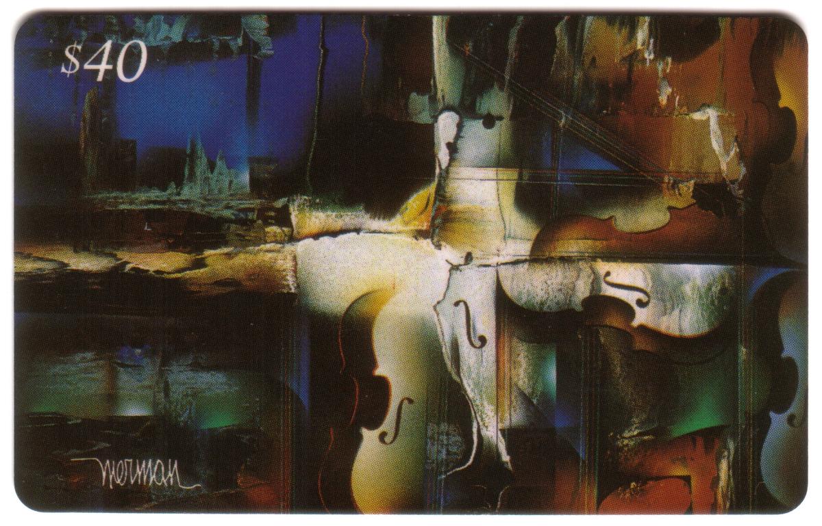 "Leonardo Nierman Painting: Moonlight" is noted at the bottom of the card alongside the name "Teleworld Internat'l," indicating the issuing entity. The card has a value of $40 printed on the front. The overall design highlights abstract arts, focusing on artistic expression through vivid colors and unique forms that suggest motion and energy.