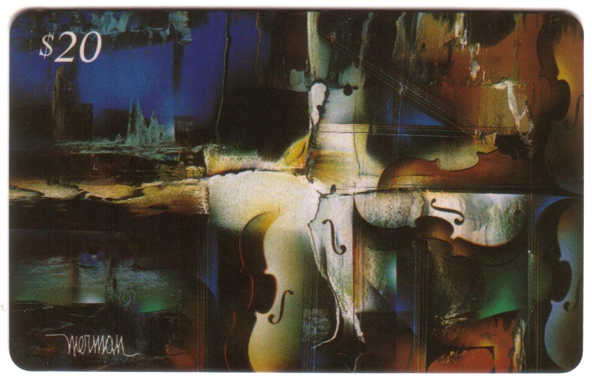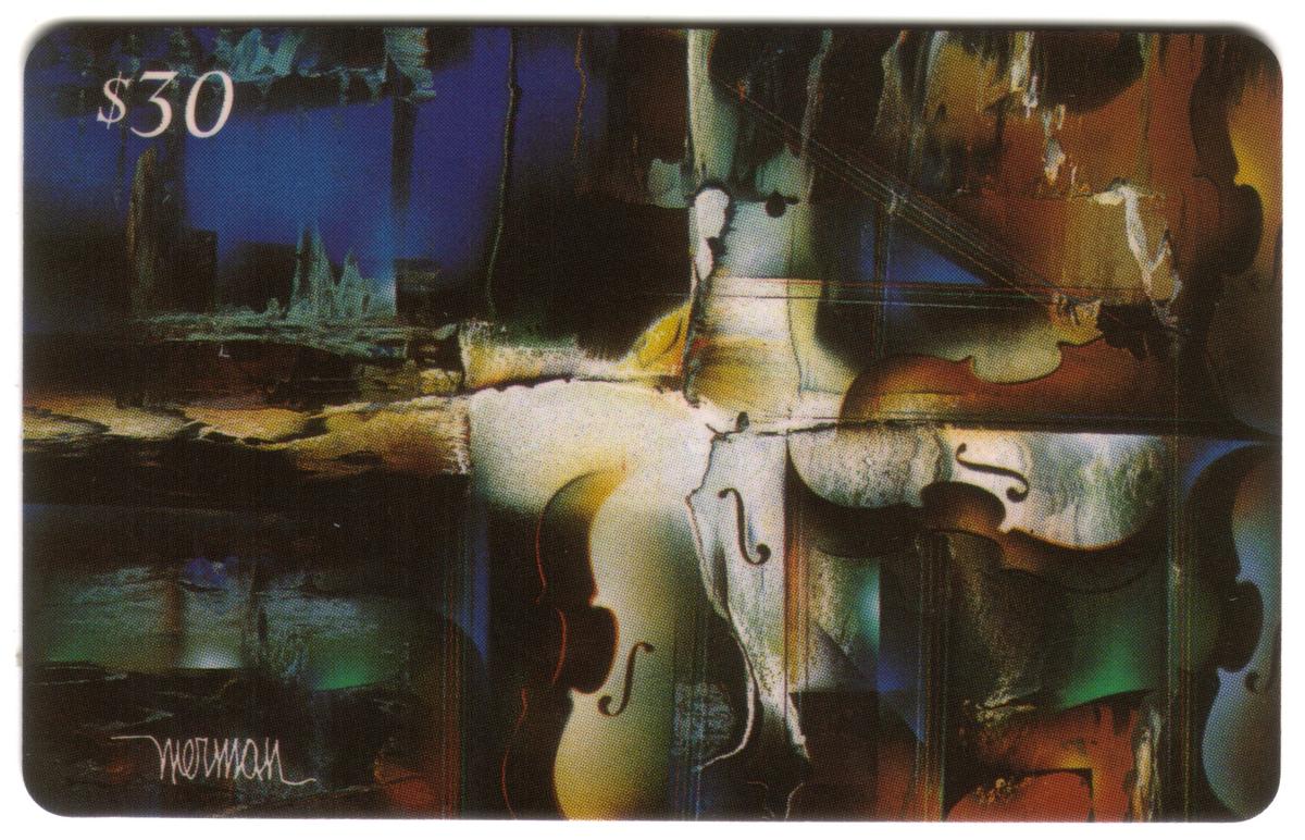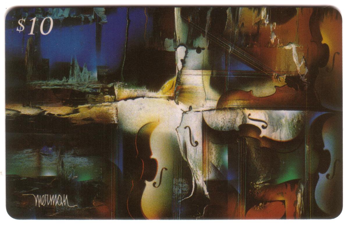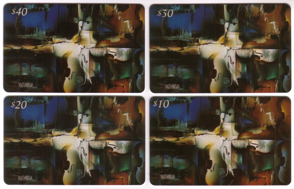Set of four Leonardo Nierman Moonlight abstract art phone cards with violin silhouettes, vibrant colors, and signature, valued at $10, $20, $30, and $40. |
