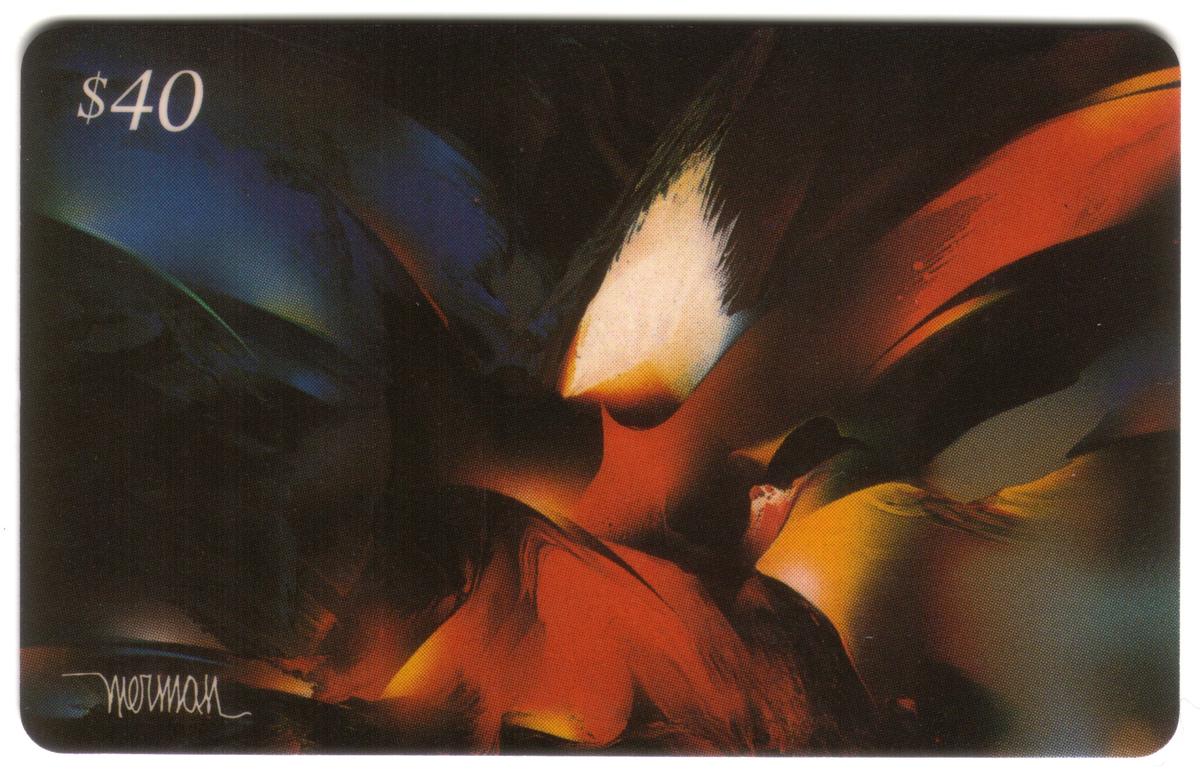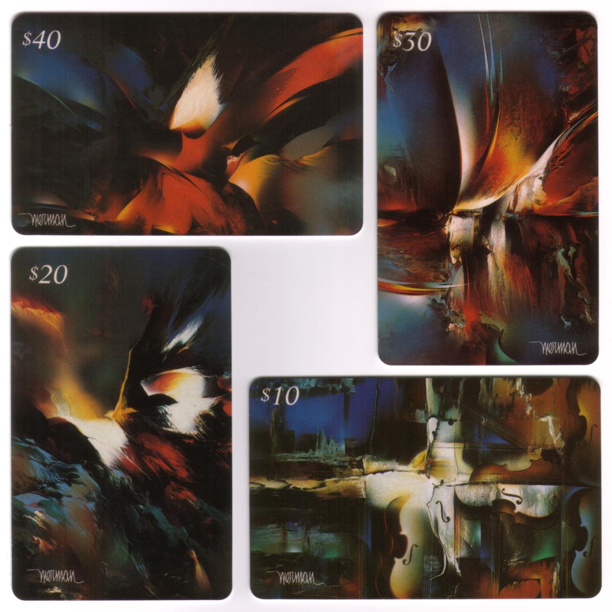 This set of four collectible cards features abstract paintings by Leonardo Nierman, each showcasing his distinctive artistic style with a rich interplay of colors and forms. Printed with face values of $10, $20, $30, and $40, the cards display intricate abstract art compositions emphasizing dynamic movement, vibrant lighting, and a blend of warm and cool tones.