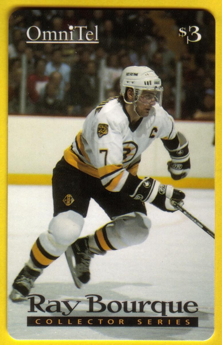 This card is issued by OmniTel and carries a $3 denomination, aligning it with collectible phone cards centered on hockey. The branding and price are integrated seamlessly with the hockey imagery and player identification, making this a focused tribute to Raymond Jean Bourque and his legacy with the Boston Bruins in the NHL.
