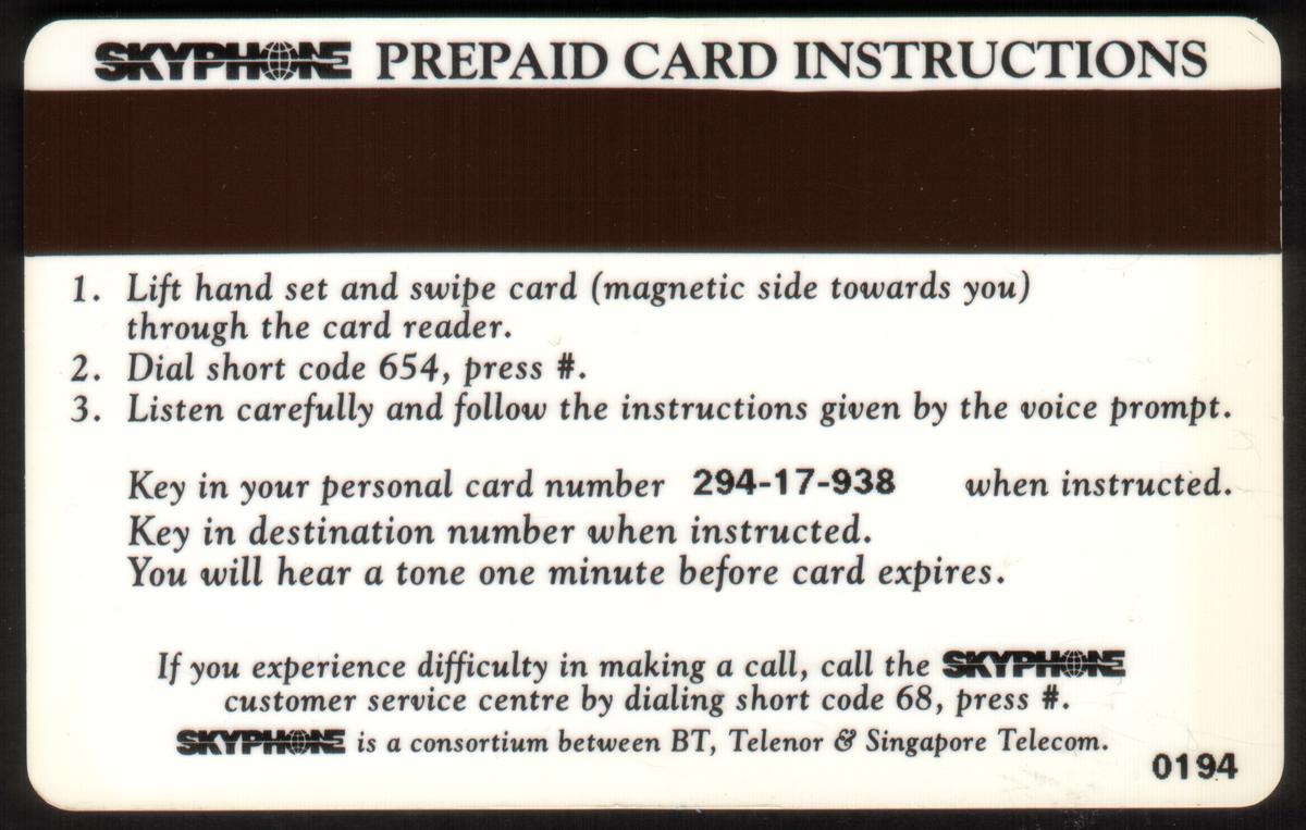 This Skyphone card is associated with in-flight telecommunication services, as emphasized by the image of a commercial airplane displayed centrally above the logo. It is connected to the consortium of British Telecom, Telnor, and Singapore Telecom, reflecting its role in providing prepaid satellite phone and fax communications aboard airplanes. The card uses a magnetic stripe for stored value and is an example of innovative telecom technology designed specifically for use in airplanes.