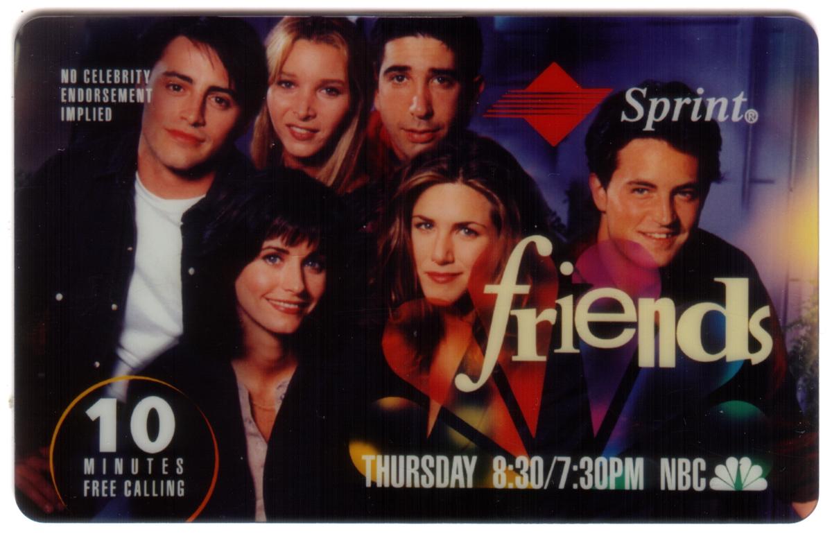 Collectible featuring the main cast of Friends, including Joey, Phoebe, Ross, Monica, Rachel, and Chandler, with nostalgic 90s TV and Sprint branding. |