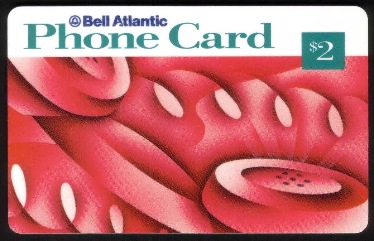 These collectible phone cards are part of a set clearly branded by Bell Atlantic and focus on retro telephone imagery with varying vibrant color themes. The intricate abstract art of the handsets stands out against the white card borders, giving the entire set a cohesive yet visually distinct appearance for each value.