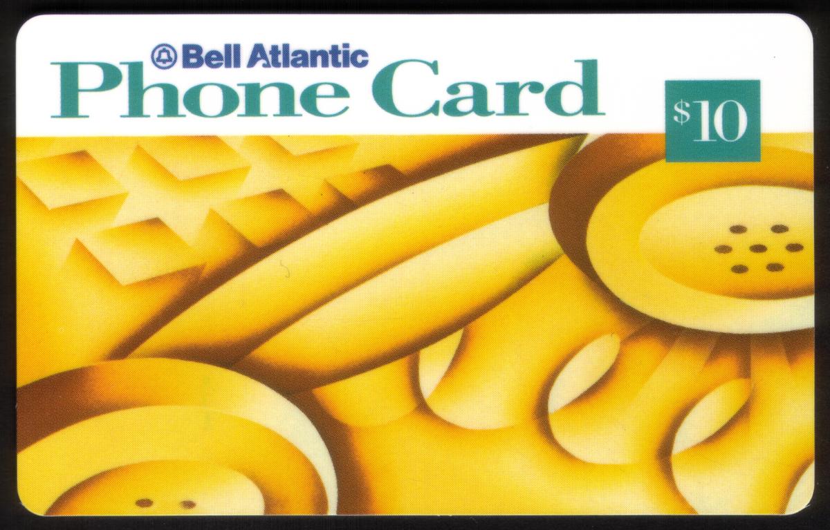 At the top center, the card displays the Bell Atlantic logo in blue letters, accompanied by the text "Phone Card" in green. The denomination "$10" is prominently shown inside a green box near the upper right corner of the card. The overall design is simple but visually striking, with an emphasis on the artistic representation of telephone equipment, fitting the 1995 D.C. Only issue. This card belongs to the series featuring phones on phonecards, highlighting telephones as the central artistic element.