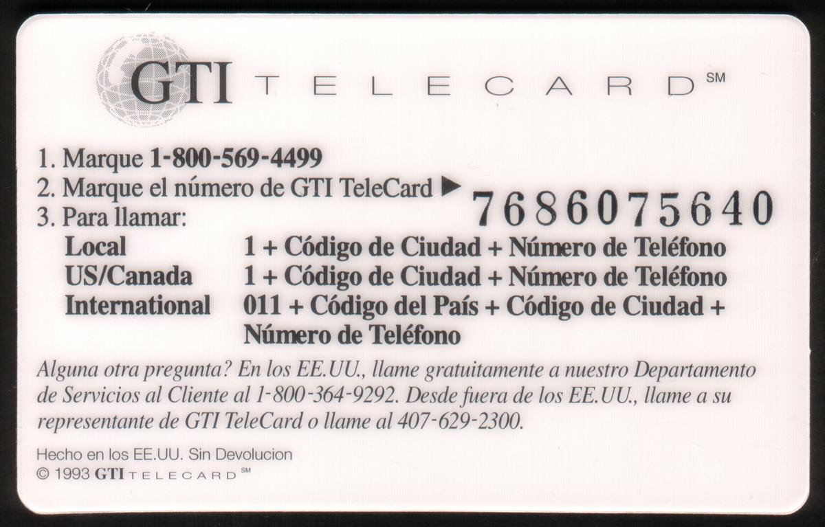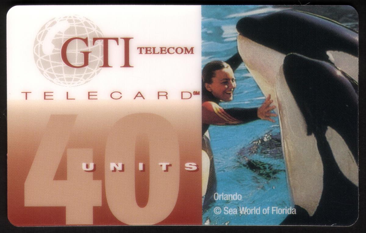 Prepaid phone card featuring Sea World of Florida with a joyful orca encounter, and a sleek GTI Telecom design highlighting 40 units of calling time. |