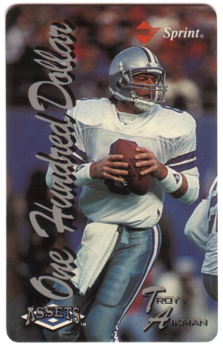 This phone card is associated with the Assets Series #1 from 1994 and includes the date 12/01/95, indicating its release or issue date. It clearly references professional American football, specifically the NFL, and highlights Troy Aikman, a key player for the Dallas Cowboys during that era. The card is valued at one hundred dollars.