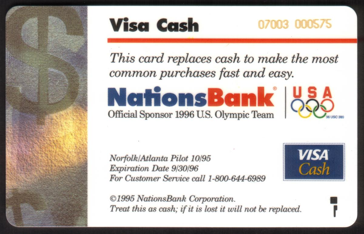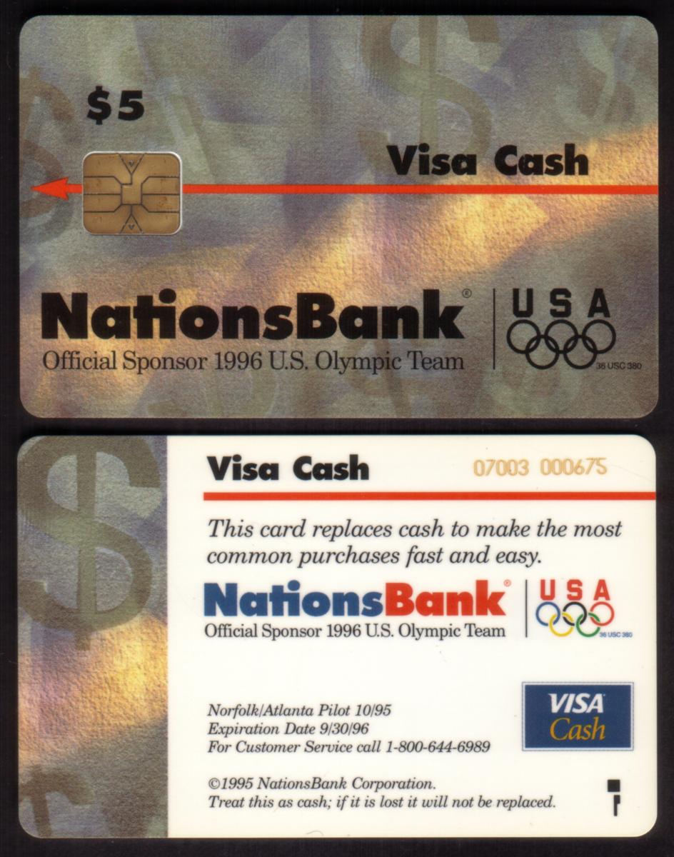 "$5" is printed in the upper left corner to show the value of the card. To the right of the value, "Visa Cash" is printed in black letters, indicating this is a Visa Cash stored value bank card. The card combines branding and the Olympic theme with a clean, modern design that emphasizes NationsBank’s role in the 1996 Olympics through visual and textual elements.