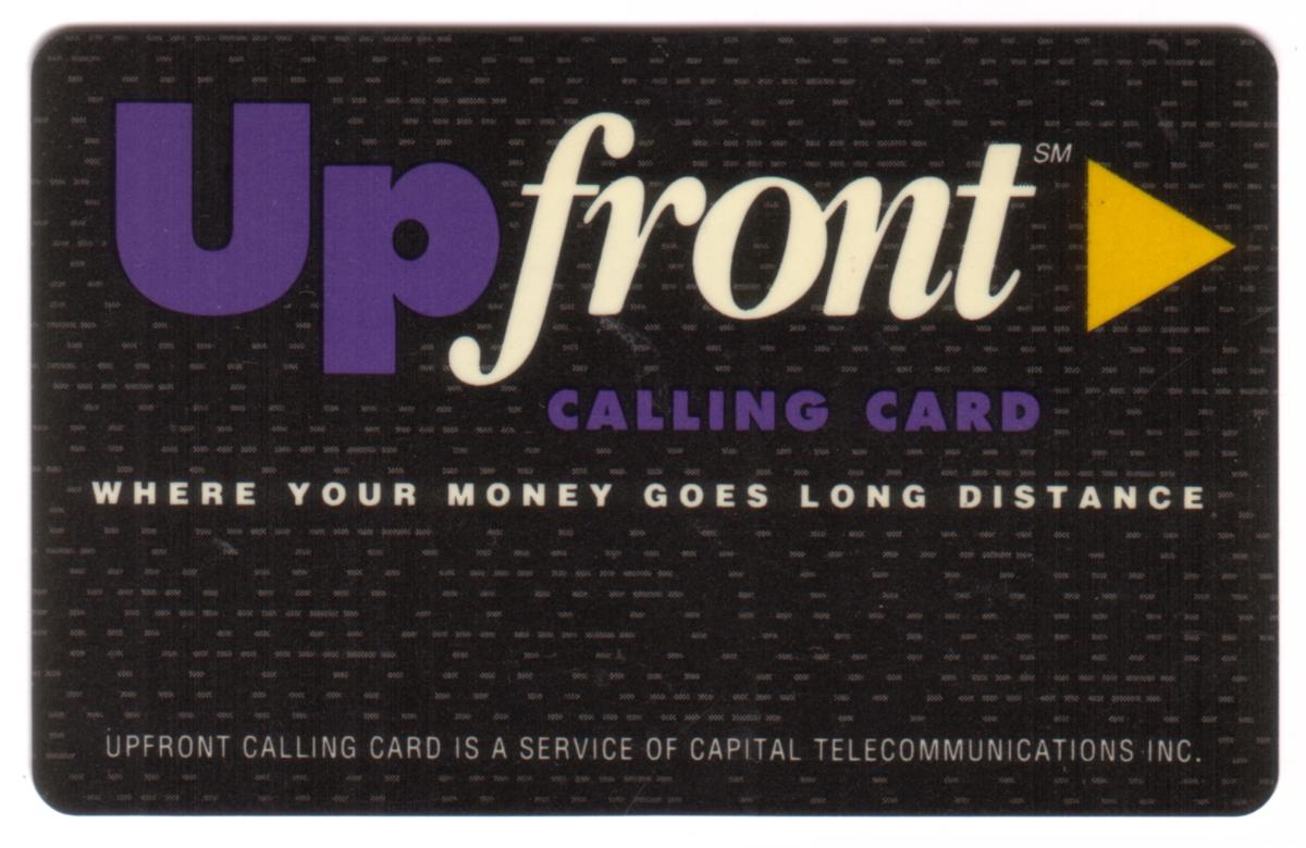 The card’s tagline "WHERE YOUR MONEY GOES LONG DISTANCE" appears in white uppercase letters centered beneath the main title. At the bottom edge, in small white uppercase text, it states "UPFRONT CALLING CARD IS A SERVICE OF CAPITAL TELECOMMUNICATIONS INC." The background is a subtle dark pattern that adds texture without distracting from the text.