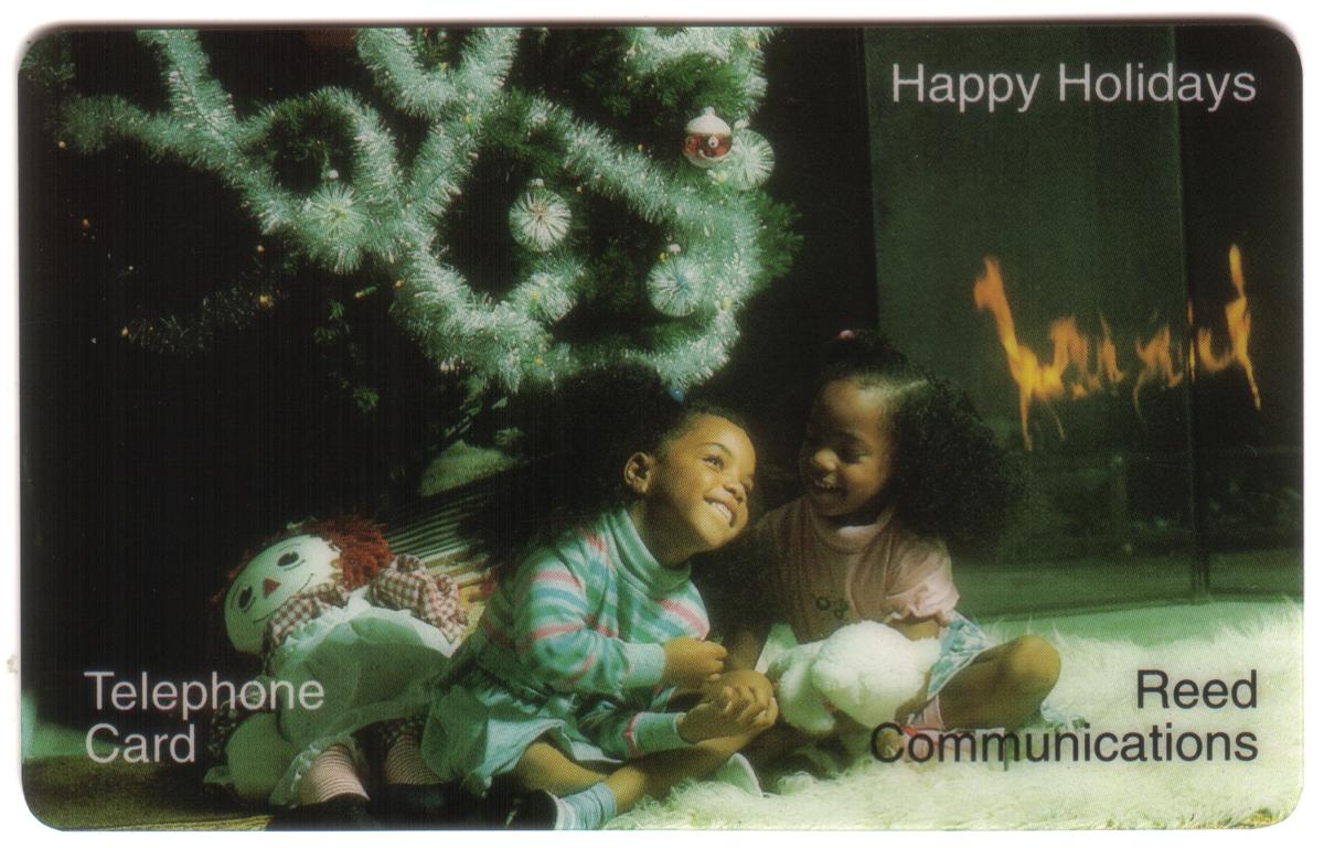 The card includes the text "Happy Holidays" prominently positioned, conveying a joyful seasonal greeting. Additional text identifies the card as a product of WorldLink Communications, with branding that reads “WorldCom” appearing in the design. The overall color scheme features traditional Christmas colors such as red, green, and white, with some subtle background elements that suggest a cozy indoor setting for the holiday celebration. The artistic style is vibrant and playful, matching the theme of children celebrating Christmas.