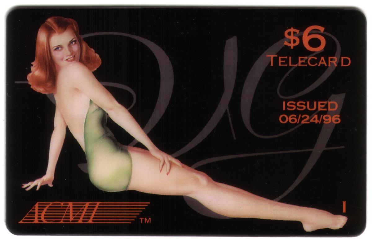 The design includes a black background with a curved yellow and red border framing the image. At the top right corner of the card, the text reads: "World War II Pin-Up Ladies Series 'I'" and "June 24, 1996." The bottom left corner displays "ACMI" indicating the issuing company. The lower right corner shows a denomination of "$6" in bold white text outlined with a red border.