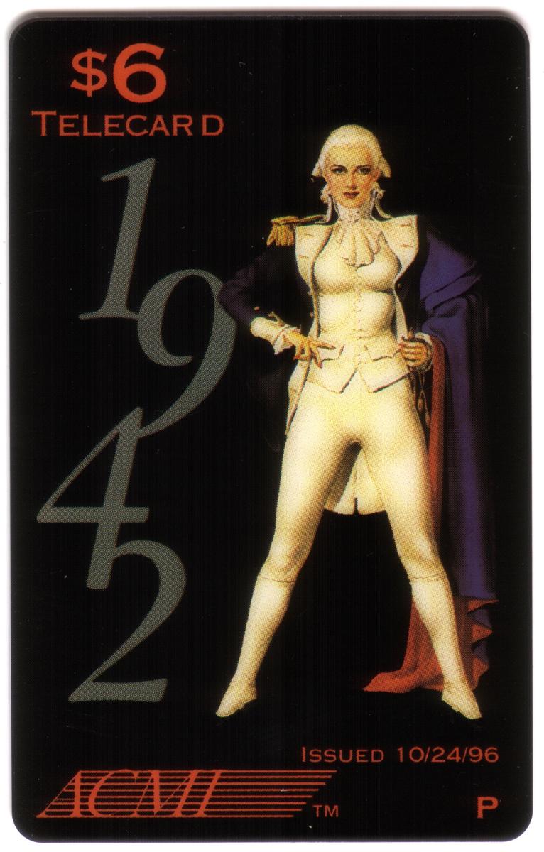 The overall design conveys a sense of nostalgia and tribute to pin-up culture and its connection to WWII, featuring clear and bright colors with emphasis on the woman and the vintage aircraft theme. The card also bears the ACMI logo, indicating its manufacturer. This phone card is part of a collectible series that honors entertainment, famous people, and celebrities tied to World War II iconography.