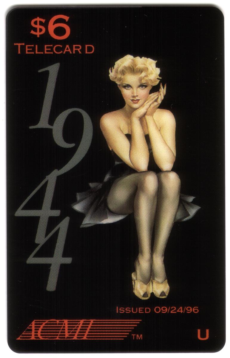 The first telecard, issued 05/31/96, shows a blonde pin-up girl lying on her side with a relaxed pose, wearing a black sheer outfit and holding a vintage telephone handset to her ear. Next, the card issued 06/24/96 depicts a red-haired woman wearing a green swimsuit, sitting with one arm resting on the ground and her legs extended straight out.