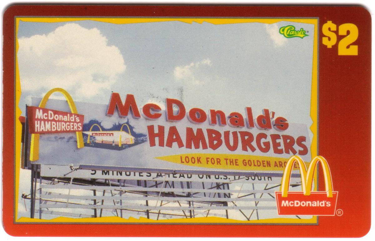 This collectible phone card features a vibrant design prominently showcasing the McDonald’s brand identity. The card displays the famous golden "M" arches logo set against a background with red and yellow hues, colors traditionally associated with the McDonald’s brand. The text “McDonald’s Hamburgers” is included, indicating a focus on the well-known fast food chain. The card also includes the year “1996,” establishing its production date.