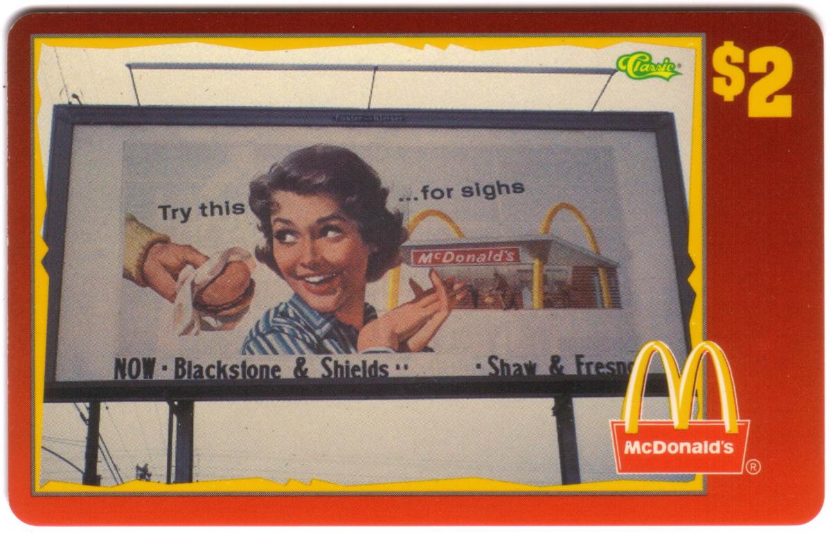 This collectible phone card features a vibrant image of a McDonald's billboard advertising from 1996. The billboard prominently displays a smiling woman holding a McDonald's hamburger, with the slogan "Try this ... for sighs." In the background of the billboard, the McDonald's restaurant is visible, including the iconic Golden Arches logo positioned above the establishment. The text "Now - Blackstone & Shields" and "Shaw & Fresn" is present underneath the main slogan on the billboard.