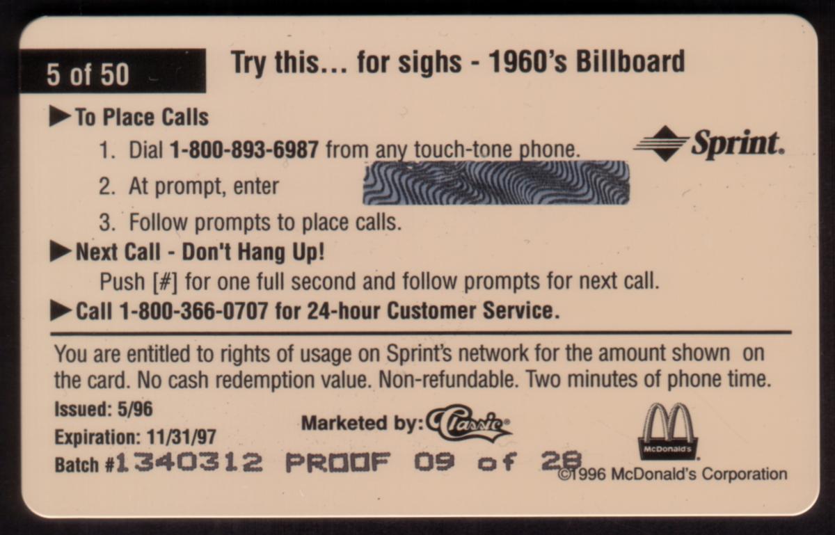 This phone card is numbered as #5 in a series of 50 and is titled "McDonald's 1996: 'Try This ... For Sighs' Billboard." It is part of the Proof Score Board (Classic) collection, issued by Clasic, and celebrates McDonald’s as a well-known fast food chain. The card captures the iconic brand through its advertisement and trademark imagery from the mid-1990s.