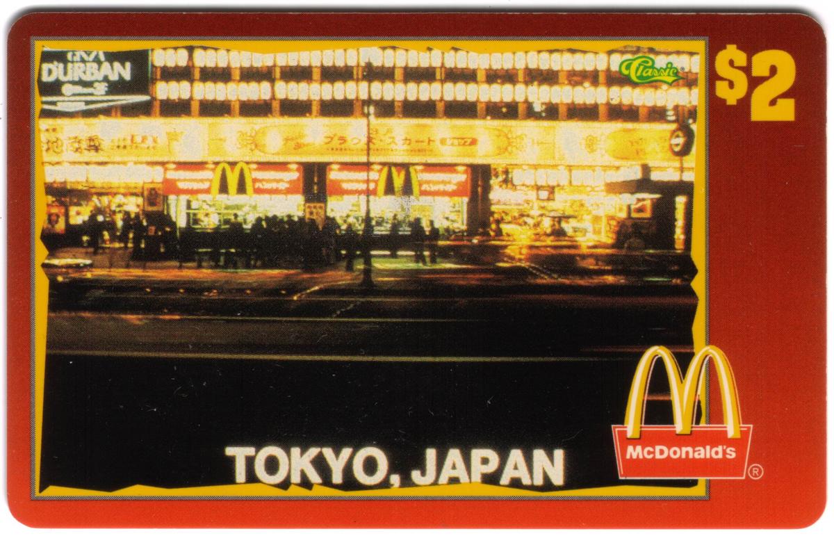 Overall, this collectible phone card presents a vivid photographic image tied to McDonald's restaurants, Japanese urban culture, and recognized global branding from the mid-1990s. It offers collectors a visual representation of McDonald's presence in Tokyo with distinctive nighttime lighting and signage.