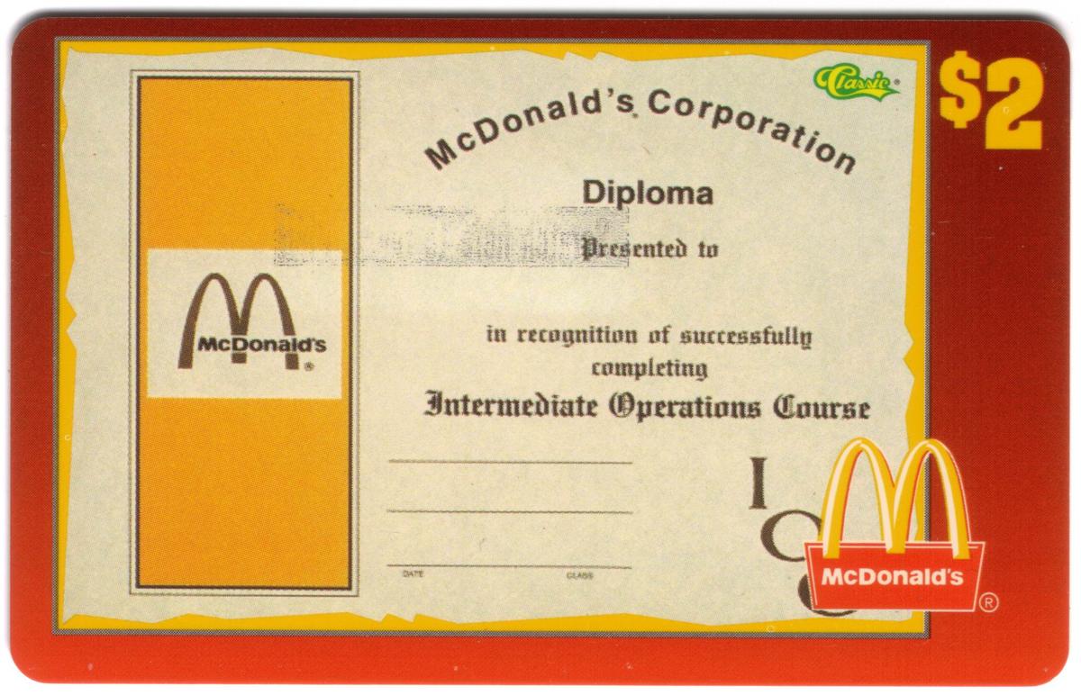 This collectible card features the McDonald's 1996 Hamburger University Operations Diploma, numbered 45 out of 50. The card prominently displays the McDonald's logo, including the iconic Golden Arches, which are central to the design. The text on the card includes "McDonald's 1996 Hamburger U. Operations Diploma (#45/50)" along with references to the intermediate operations course and a price notation of $2.