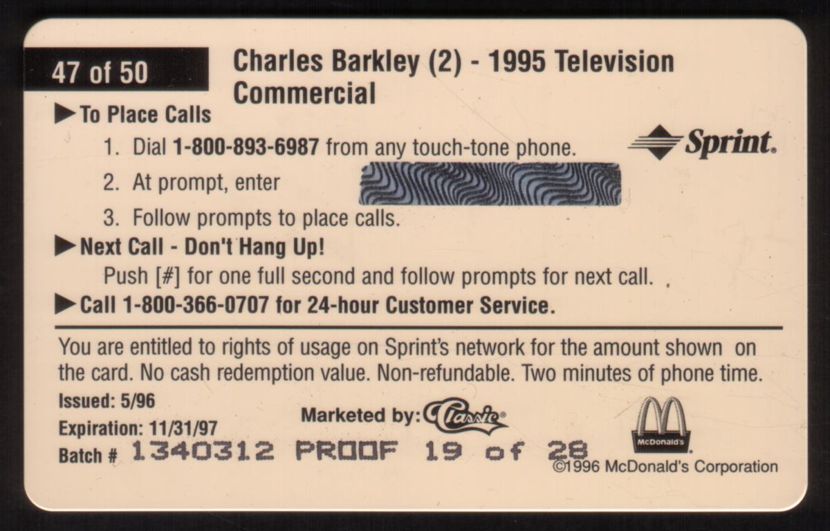 This 1996 McDonald's collectible phone card commemorates Charles Barkley's involvement in a 1995 TV advertisement campaign associated with McDonald’s basketball promotions. The card highlights Barkley as one of the Most Valuable Players (MVPs) connected to the fast food chain’s sports-themed marketing during that time.