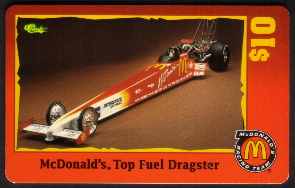 The card’s theme clearly celebrates auto racing, highlighting McDonald’s sponsorship and involvement in the sport during the 1990s. The visual and textual elements together make it a numbered item in a limited series, targeted at collectors interested in motorsports memorabilia, especially those focusing on drag racing and Top Fuel dragsters.