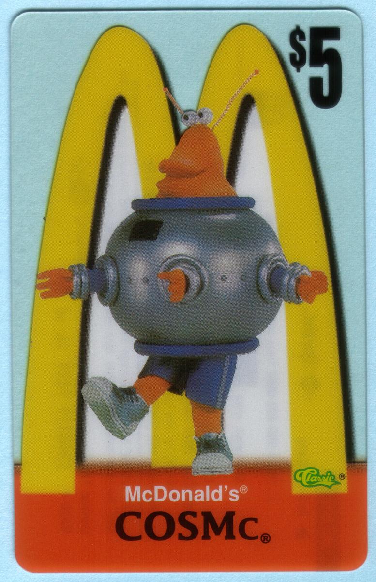 This collectible card features COSMc, the McDonald's robot character from 1996, appearing as number 4 in a series of 10. COSMc is depicted standing in a robotic pose, detailed with metallic joints and a futuristic design reminiscent of science fiction robots. The character is set against a neutral background that emphasizes the robot's intricate design.
