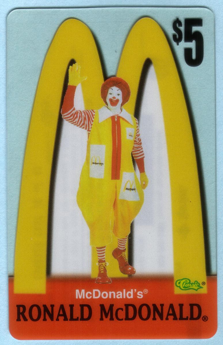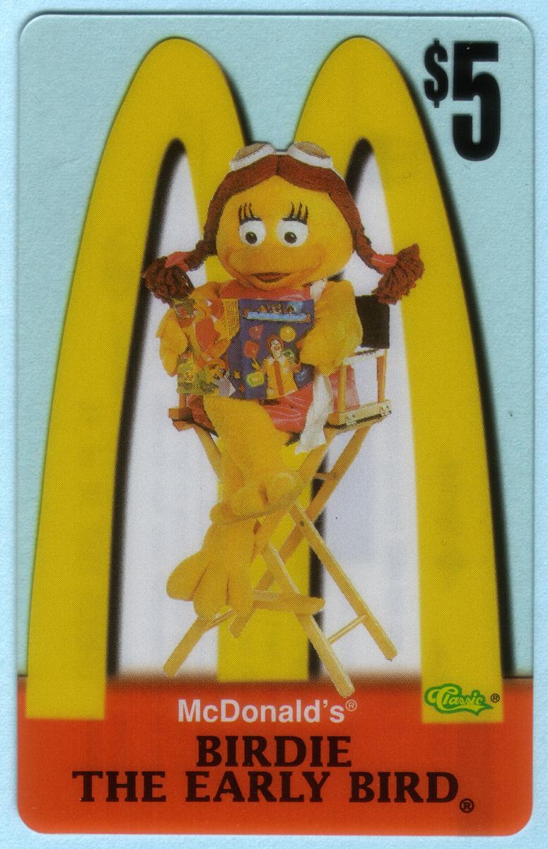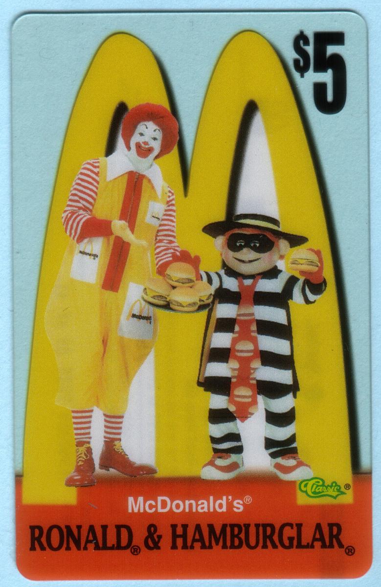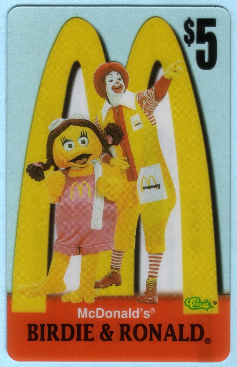 Ten 1996 McDonald''s phone cards featuring Ronald McDonald, Grimace, Hamburglar, Birdie, Fry Girls, and CosMc with Golden Arches logo and $5 value. |