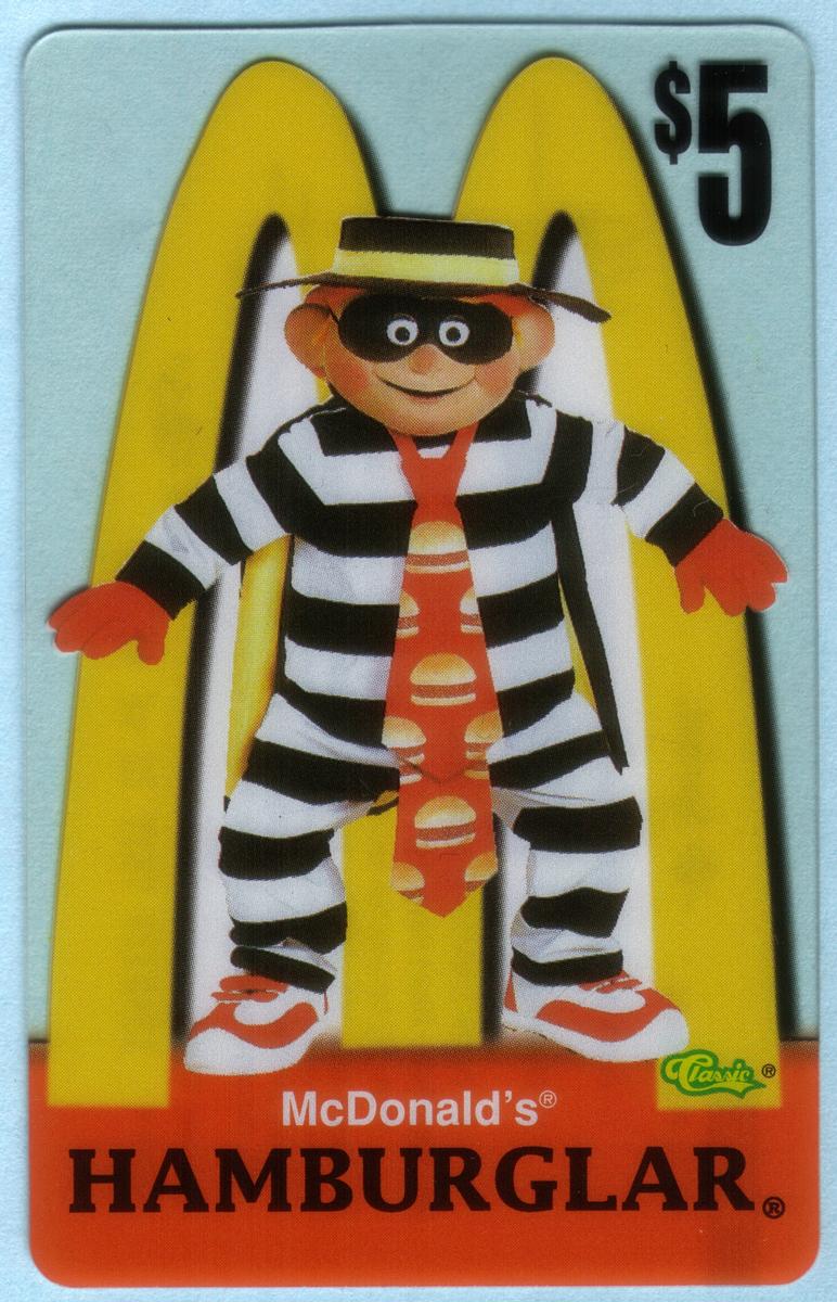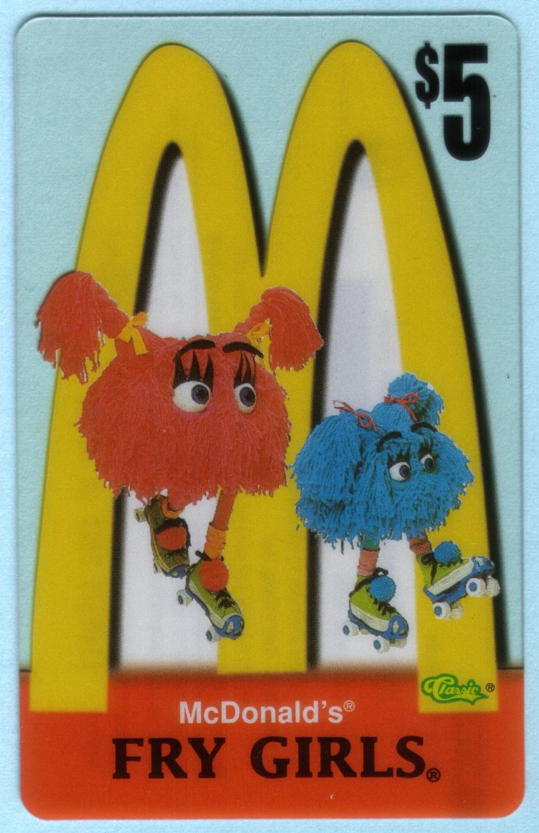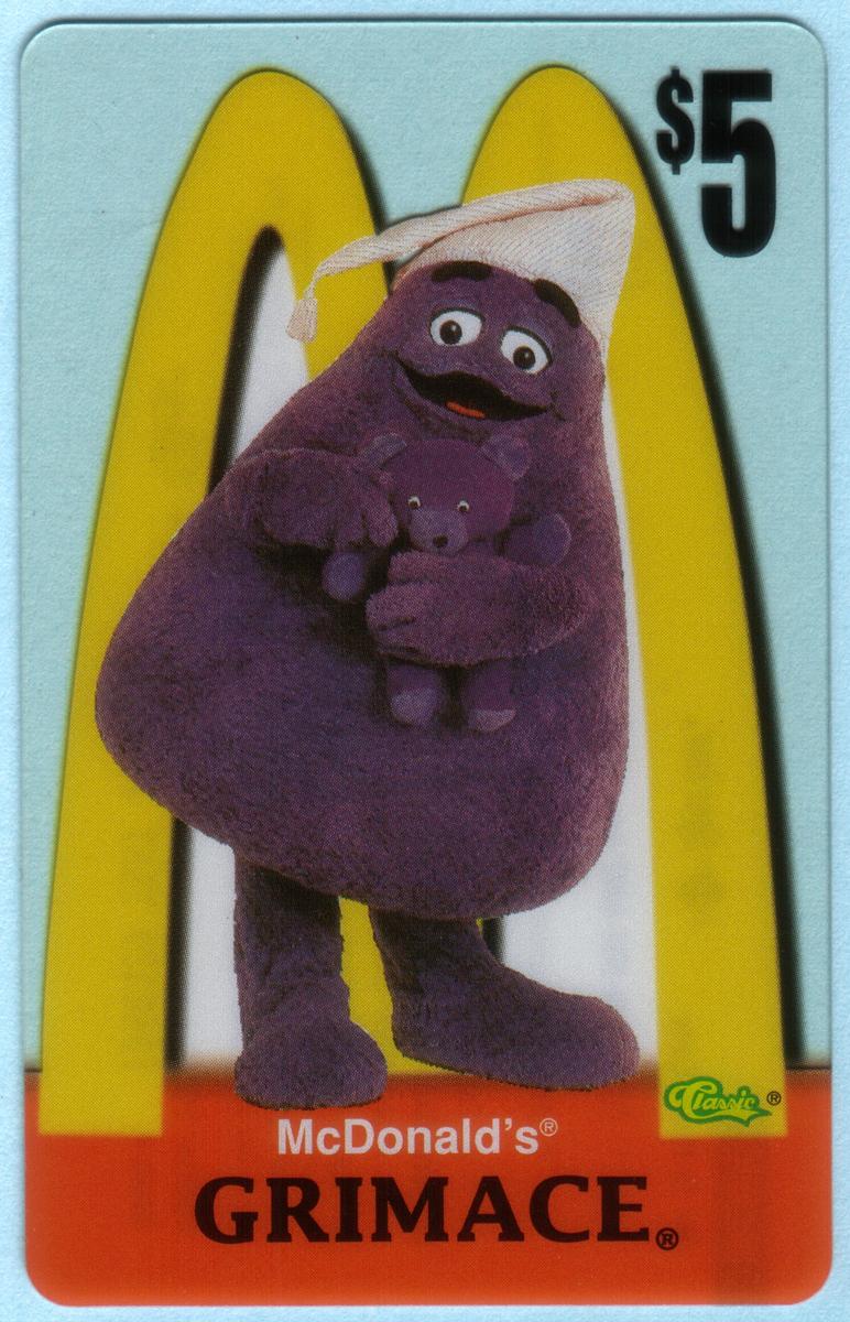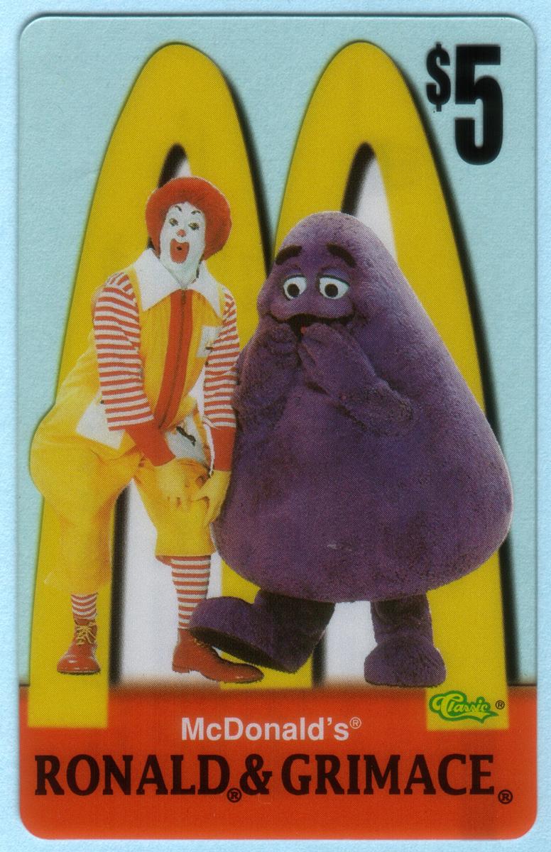 Ten 1996 McDonald''s phone cards featuring Ronald McDonald, Grimace, Hamburglar, Birdie, Fry Girls, and CosMc with Golden Arches logo and $5 value. |