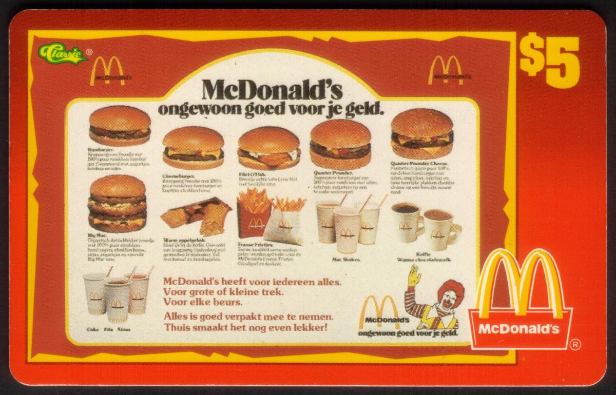 The design includes the iconic Golden Arches logo associated with McDonald's, set within a colorful layout. The card’s denomination is $5, clearly printed on the surface. The overall visual style of the card connects to 1970s McDonald’s restaurant menus in the Netherlands, referencing nostalgic elements from that era as part of the collectible series.
