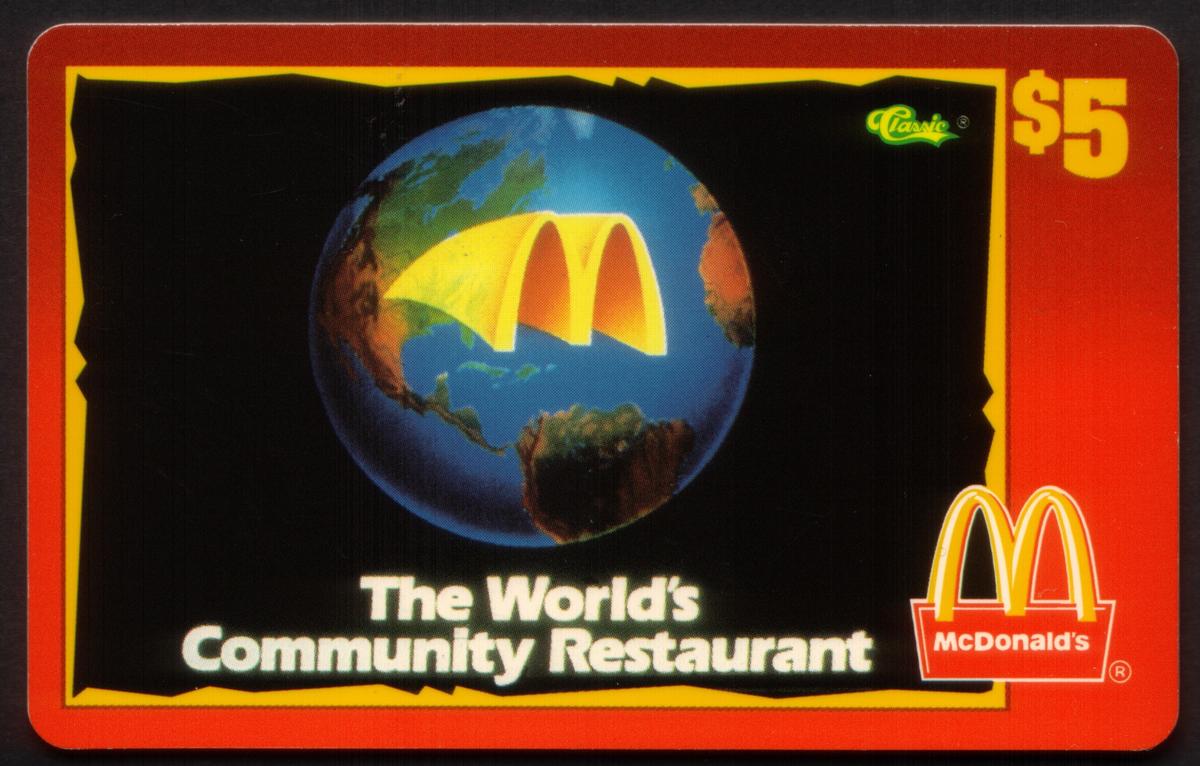 This collectible chip card features the McDonald's 1996 World's Community Restaurant design. The card prominently displays the iconic Golden Arches logo associated with McDonald's, one of the world’s leading fast food chains and restaurant brands. The illustration includes a depiction of an earth globe, integrating the McDonald's branding alongside symbols of global community and outreach.