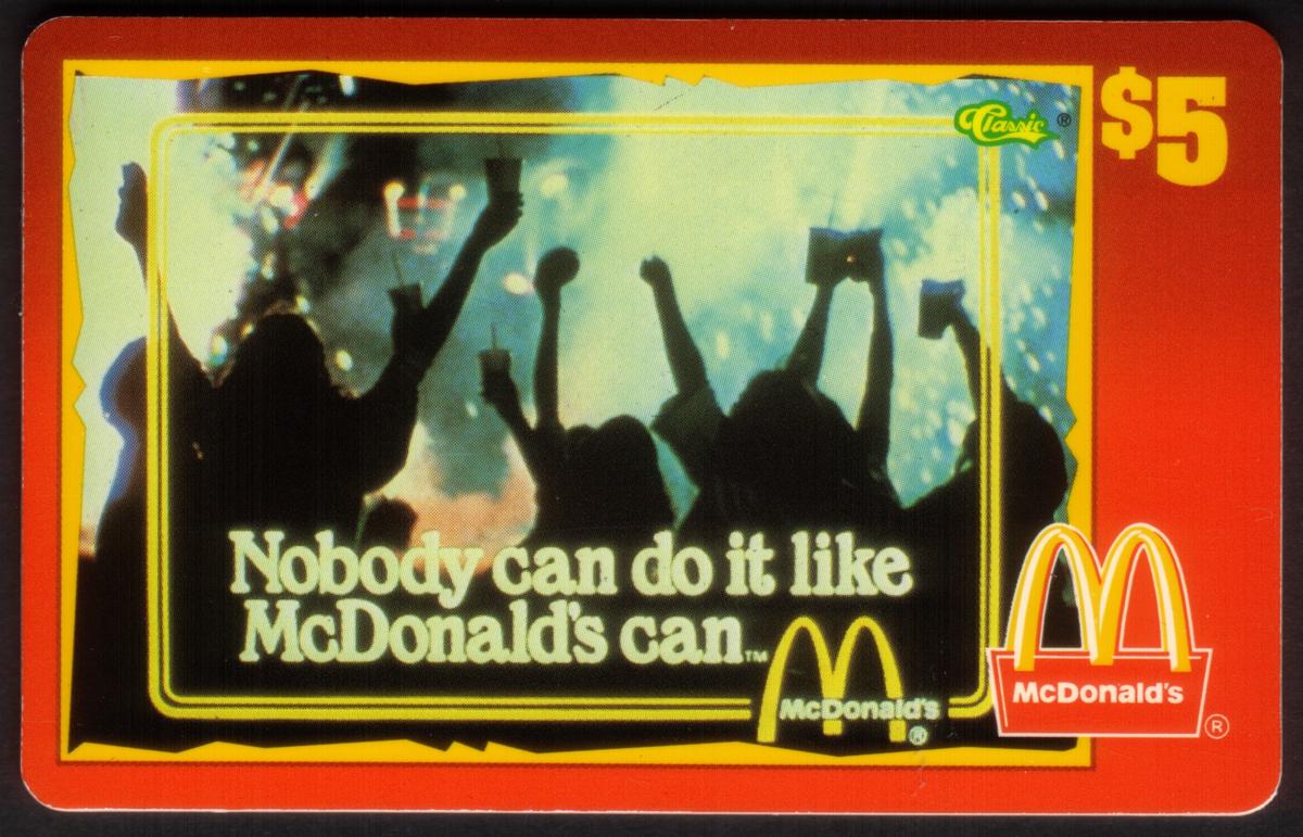 This collectible phone card features branding from McDonald's, the well-known fast food chain recognized worldwide for its Golden Arches logo. The card highlights McDonald's 1996 advertising campaign titled "Nobody Can Do It…" This campaign emphasizes the unique qualities and unmatched offerings of the McDonald's restaurant chain. The design includes the classic McDonald's logo prominently displayed, capturing the brand's identity.