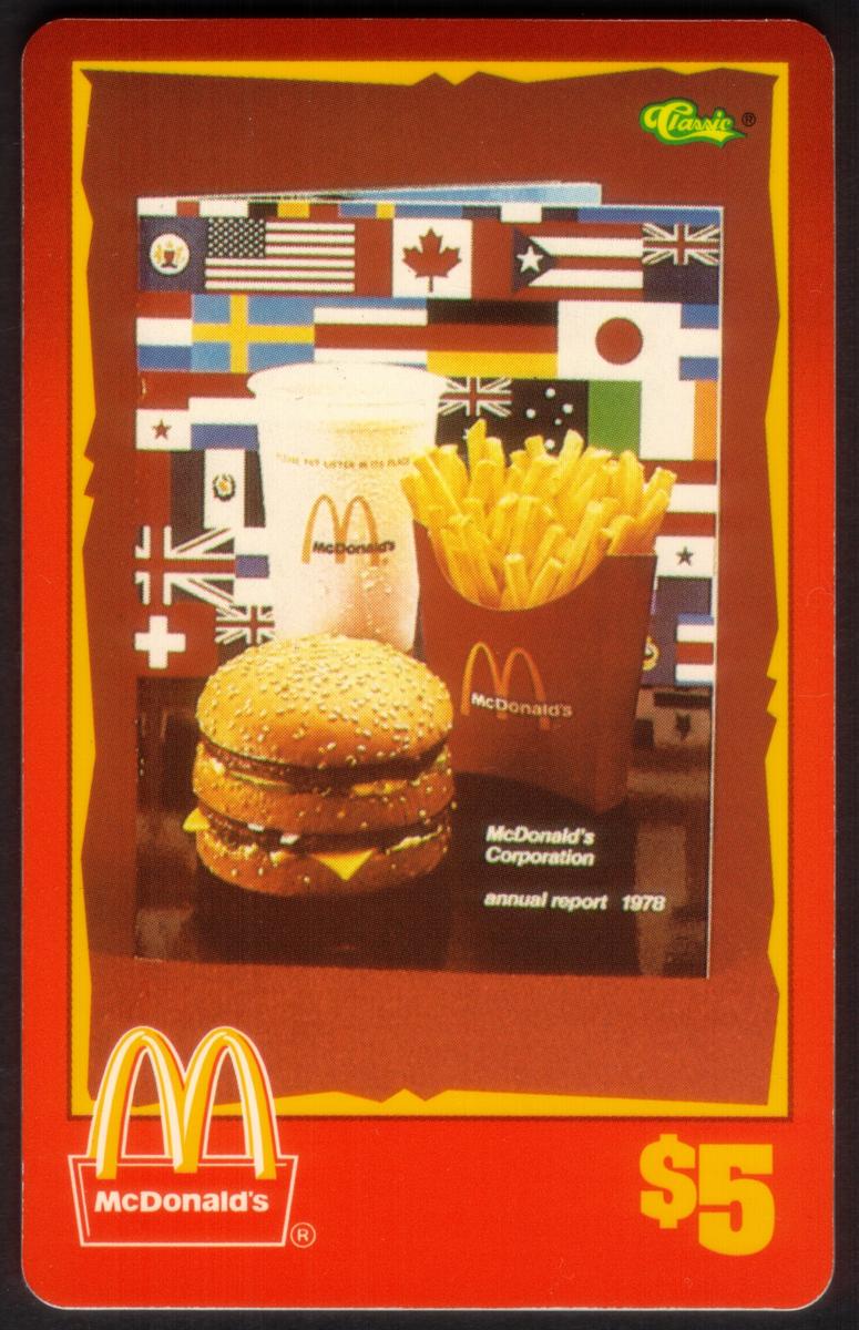 McDonald''s 1996 phone card featuring a double cheeseburger, fries, drink, international flags, Golden Arches logo, and a bold red border, celebrating global growth. |