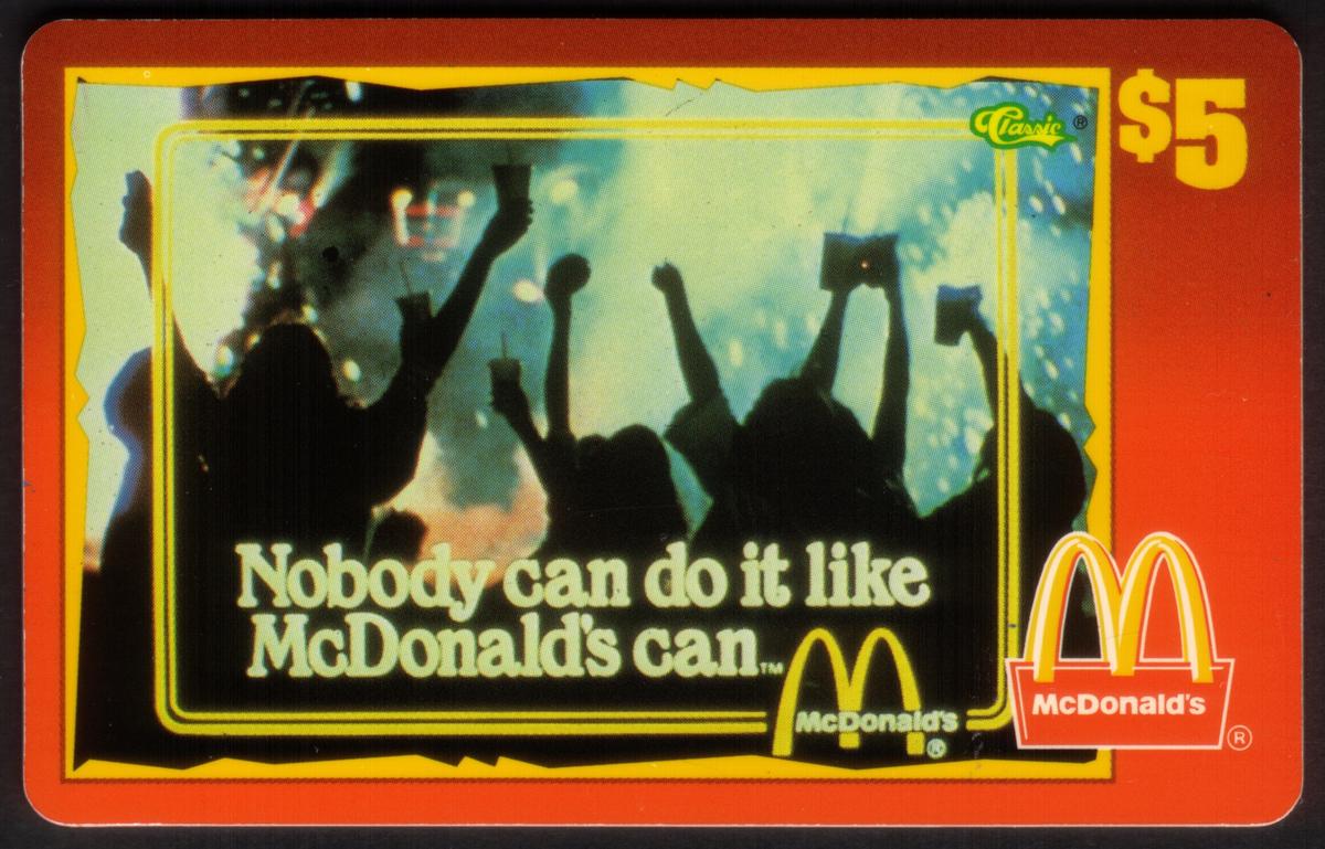 The artwork combines bold typography with bright red and yellow colors, reflecting McDonald's brand palette. The phrase "$5" is also visible, referencing the value or theme within the campaign. This card highlights McDonald's as a leading fast food chain known for its distinctive logos, trademarks, and advertising style.