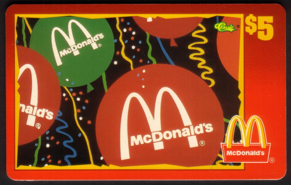 In the upper right corner, the value of the card is marked as "$5" in bold yellow text. The Cavic logo appears in green near the top right area of the colorful rectangle framing the balloon design. In the lower right corner of the card, the McDonald's Golden Arches logo is shown again, with "McDonald's" written beneath it in white over a red rectangular background.