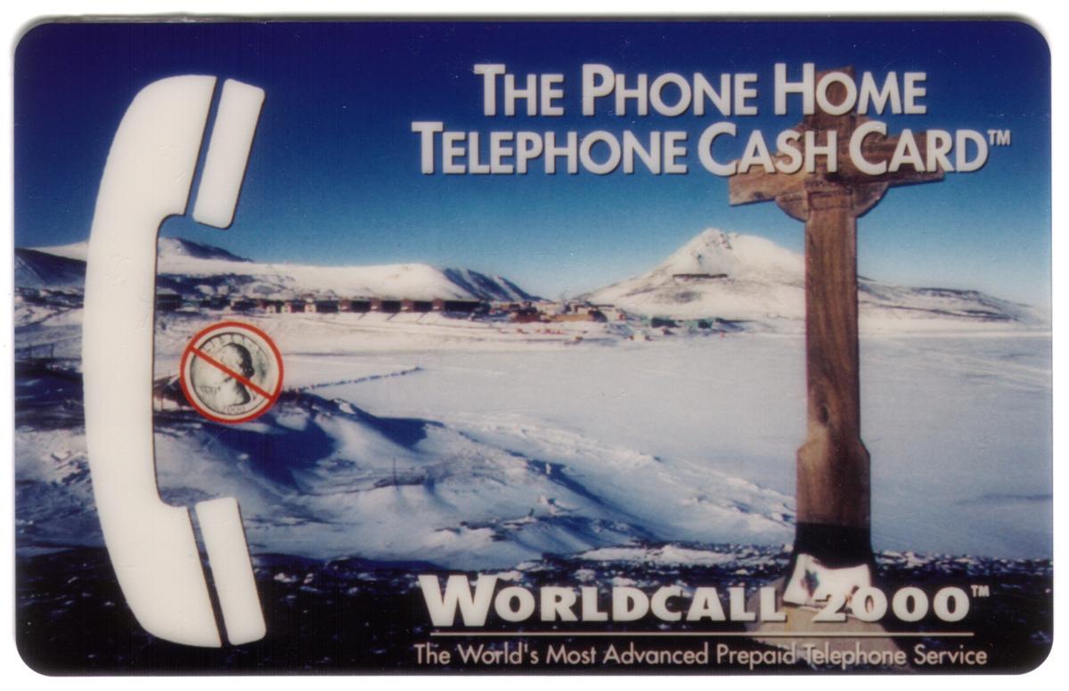 This particular phone card is used and carries the keywords including mountains, phones on phone cards, telephones on phonecards, handset, cct, computerized calling technologies, Antarctica, and WorldCall 2000. It is part of collectible telecommunications cards showcasing innovative prepaid phone services linked to Antarctica and advanced telephone cash card technology.