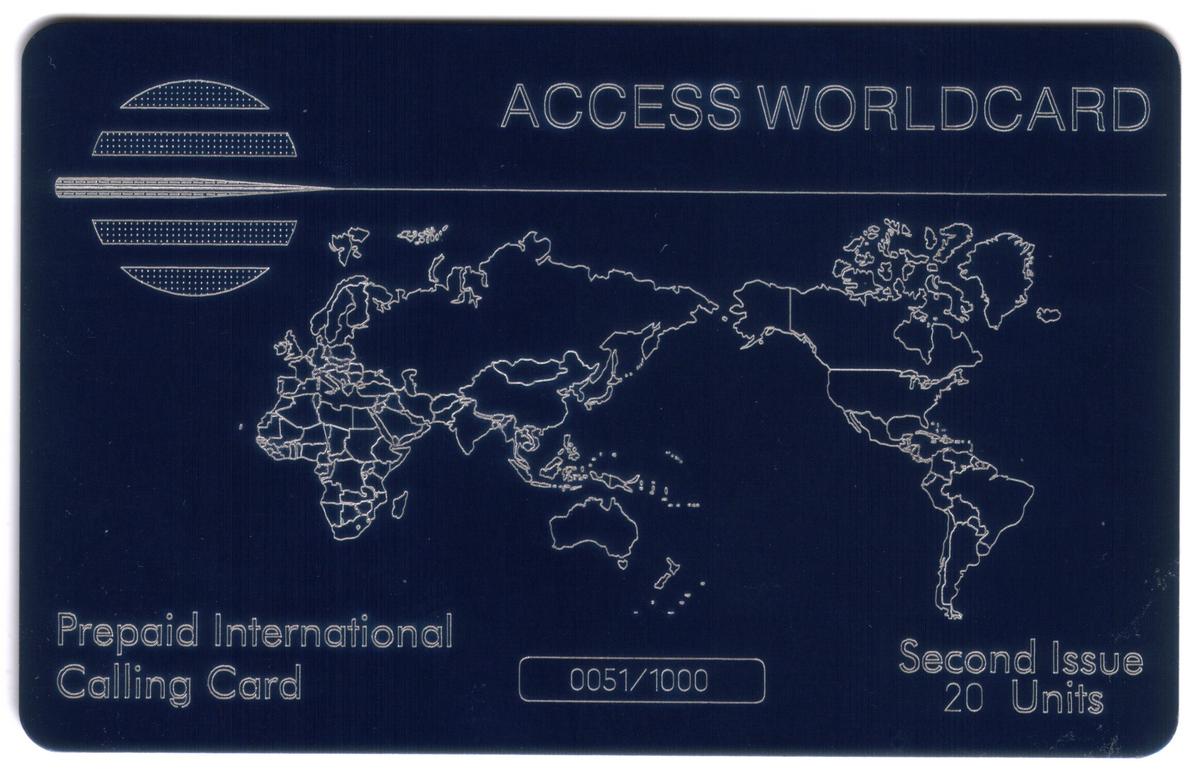 This set of five collectible prepaid international calling cards is titled "ACCESS WORLDCARD," produced by Access Telecom, Inc. Each card features a laser-engraved world map, detailing continental outlines and country borders. The design is minimalist with a modern look, utilizing precise line art and clean typography. Positioned prominently at the top right, the words "ACCESS WORLDCARD" are engraved, while the left side displays the globe’s longitude and latitude lines in a stylized circular pattern.