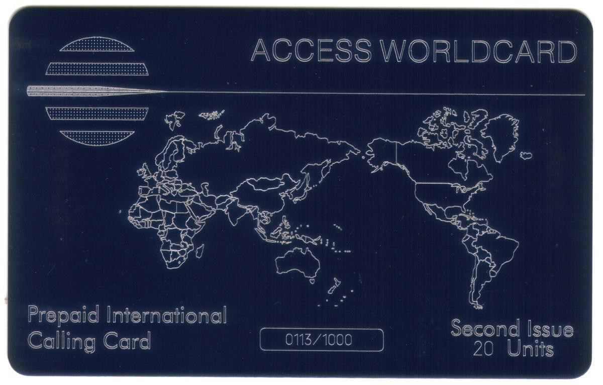 The Access WorldCard is a prepaid international calling card issued by Access Telecom, Inc. This card is a purple second issue, laser engraved on aluminum, and offers 20 units of calling credit. The front of the card features a detailed, engraved world map that highlights global continents and countries with clear border lines. Above the map, the prominent text "ACCESS WORLDCARD" is displayed in uppercase, emphasizing the card's international calling purpose.