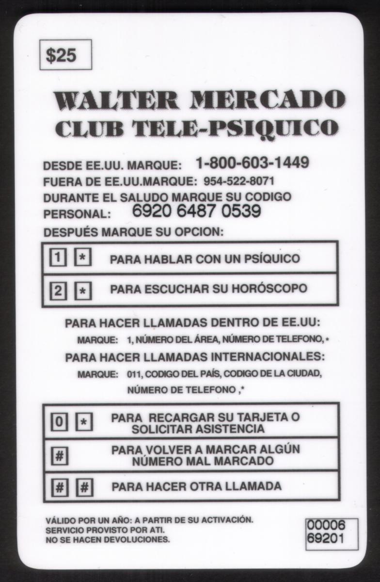 | $25. De Walter Mercado, The Magus Club Tele-Psiquico Psychic Telecard |