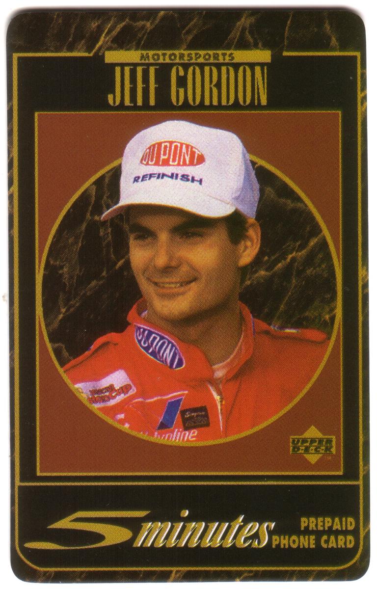 This collectible prepaid phone card features a photographic image of Jeff Gordon, a well-known NASCAR driver, presented in a portrait-style oval frame near the top center of the card. Jeff Gordon is shown wearing a white cap with the "DuPont Refinish" logo prominently displayed in red and blue on the front. He is dressed in a red racing suit adorned with sponsor logos, including a visible "DuPont" patch near the collar and additional racing insignias.