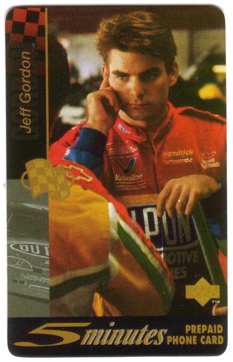 This phone card highlights Jeff Gordon's association with Hendrick Motorsports and the automotive brands sponsoring him, making it a valuable collectible for fans of auto racing and NASCAR memorabilia.