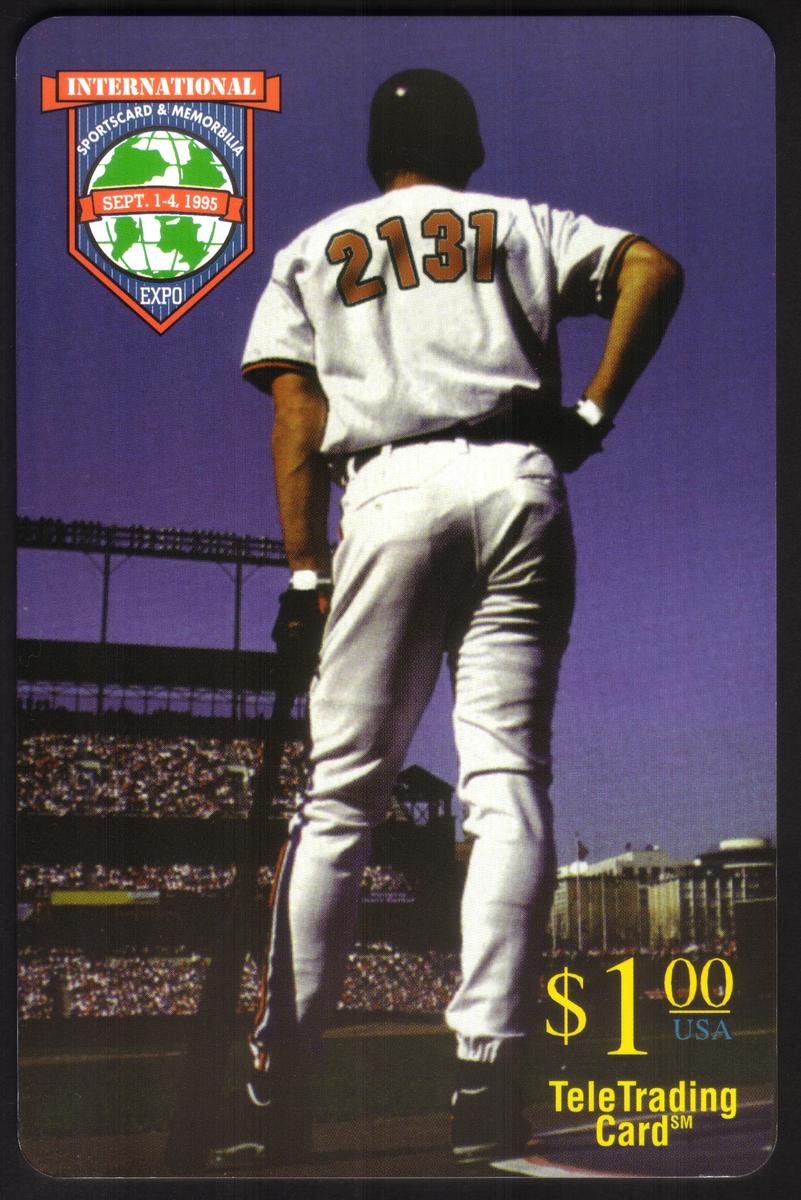 This collectible card features Cal Ripken Jr., a legendary baseball player known for his record-breaking consecutive games played. The card honors Ripken’s achievement of 2,131 consecutive Major League Baseball games, a milestone celebrated at the International Sportscard & Memorabilia Expo held in September 1995. The design includes the official MLB logo, emphasizing its connection to Major League Baseball. The card prominently displays the denomination "$1" in the upper right corner, indicating its value.