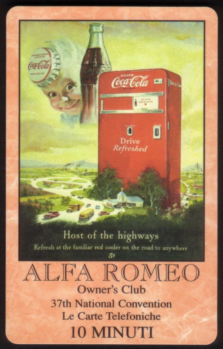 Text at the bottom of the card highlights its connection to the Alfa Romeo Owner's Club 37th National Convention, with the card providing "10 MINUTI" (10 minutes) prepaid telephone credit. Additional text includes "Le Carte Telefoniche," indicating its Italian origin. The card integrates Coca-Cola logos and branding status as well as Alfa Romeo and the 37th National Convention, linking collectible interest in automotive and beverage memorabilia.