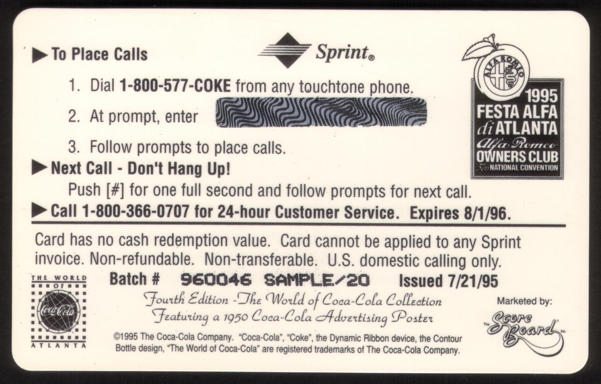 The lower border of the card is peach-colored and features formal text in black, specifying the event and usage details. This card is issued by The Score Board Inc. and carries design elements that celebrate both Coca-Cola’s historic advertising and automobile culture through the Alfa Romeo club event.