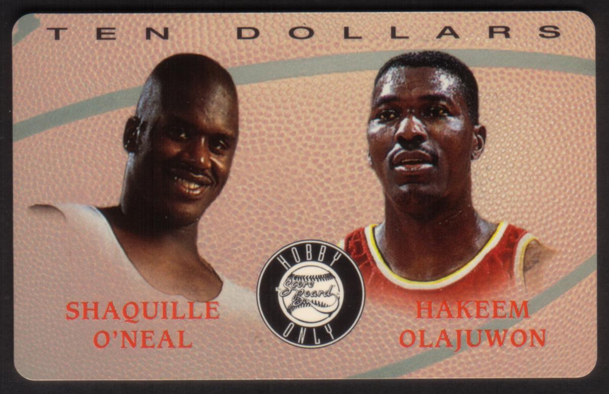 This collectible phone card features images of basketball legends Shaquille O'Neal and Hakeem Olajuwon. Shaquille O'Neal is shown on the left side of the card, smiling and wearing a white top, while Hakeem Olajuwon is on the right side wearing a red basketball jersey with yellow trim. Between them is a circular logo with the words "Hobby Only" and a basketball graphic inside.