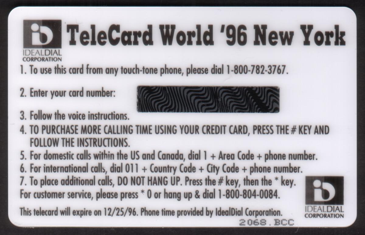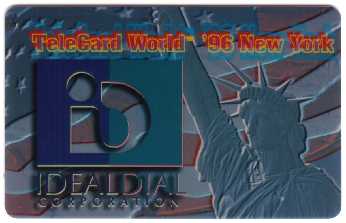 This card is a commemorative collectible linked to the TeleCard World ’96 event in New York and reflects Americana themes through its imagery and use of national symbols. It is issued by IdealDial Corporation and celebrates national monuments and trade shows with a design that honors the United States.