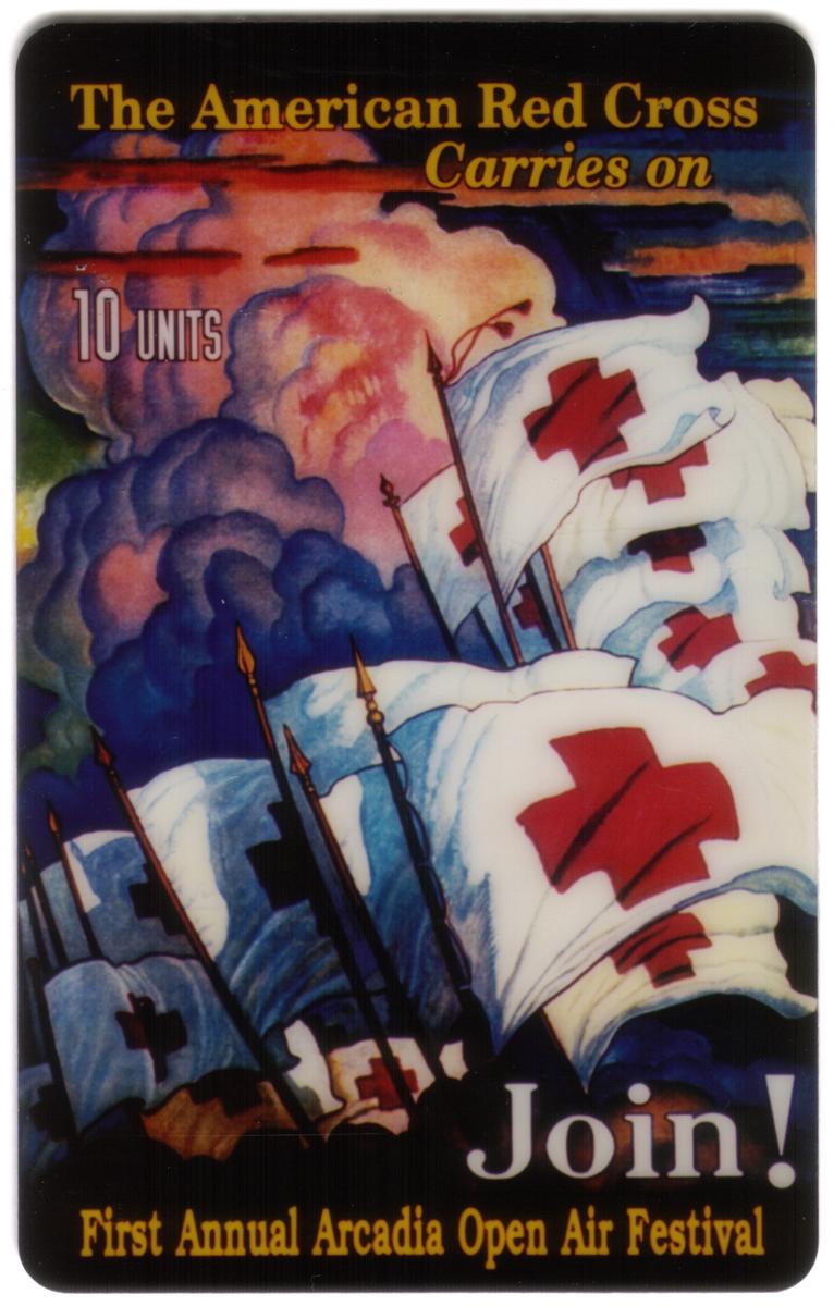 At the top of the card, gold text reads "The American Red Cross Carries on," conveying a message of perseverance and ongoing effort. The card’s unit value "10 UNITS" is displayed on the upper left side, and the bottom portion features additional gold text promoting the event: "First Annual Arcadia Open Air Festival." The word "Join!" appears in bold white letters near the lower center, encouraging participation.