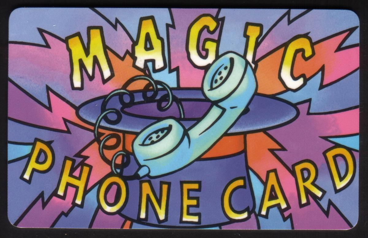 The overall style combines elements of cartoon and comic artwork, with clear, smooth lines and bright colors that emphasize the playful theme of magic interacting with telephone technology. This phone card is a visually striking example of artistic phone card design linking magicians and telephones.