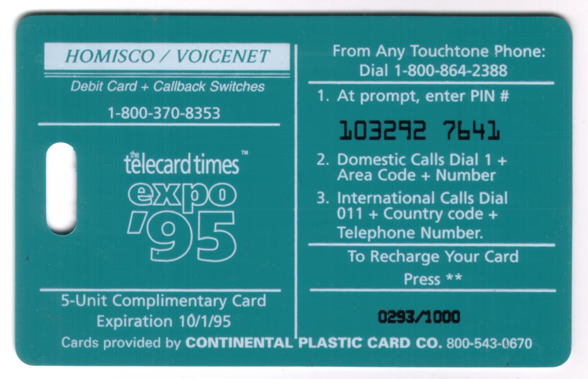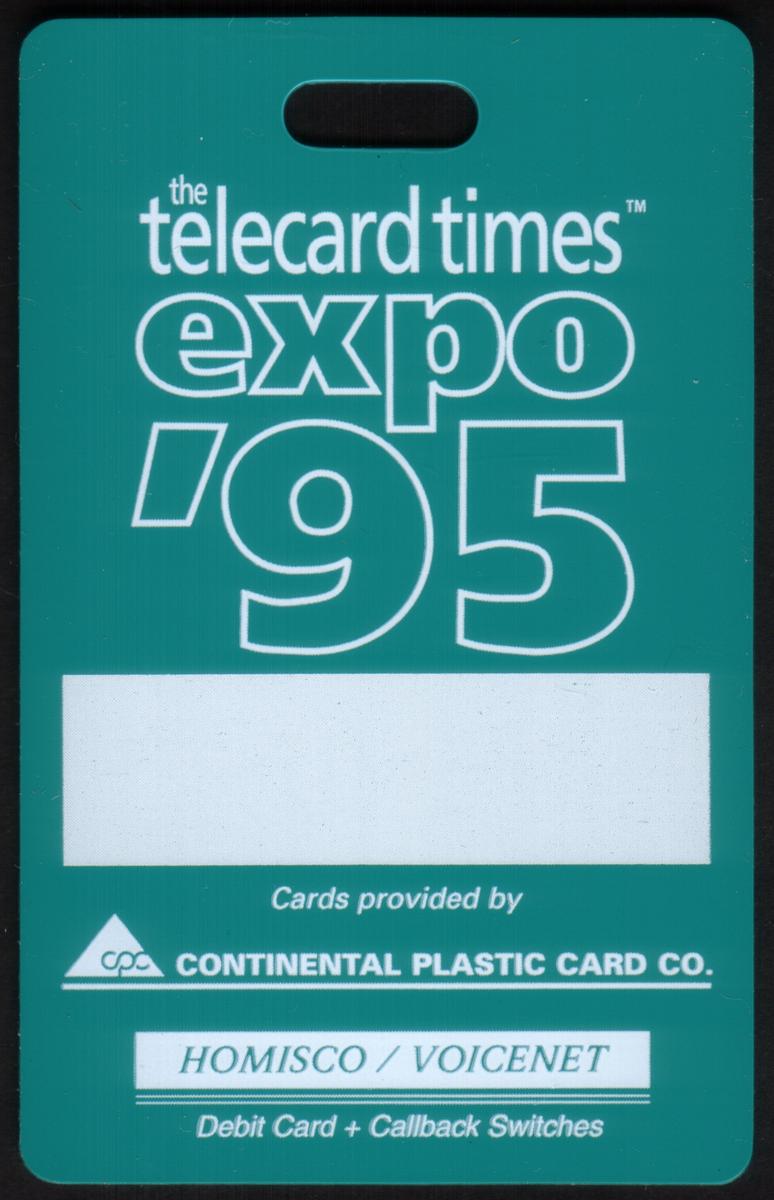 This card is linked to the Telecard Events at the Times Expo in 1995, associated with HOMISCO and Voicenet, and was distributed at notable locations such as JFK International Airport and the Travelodge Hotel in New York. It is an aquamarine-colored, complimentary card related to Voicenet’s 5m Telecard series.